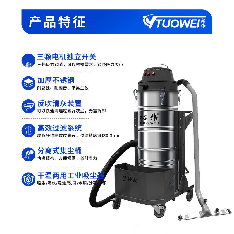 品牌:拓炜适用范围:本系列产品属于单相电动工业吸尘器,采用三颗阿美德格电机,加厚不锈钢分离筒设计,用于清理回收粉尘、物料、加工屑等工业废弃物,广泛用于加工制造、石油化工、航空航天、军工、化学制药、食品等行业。...