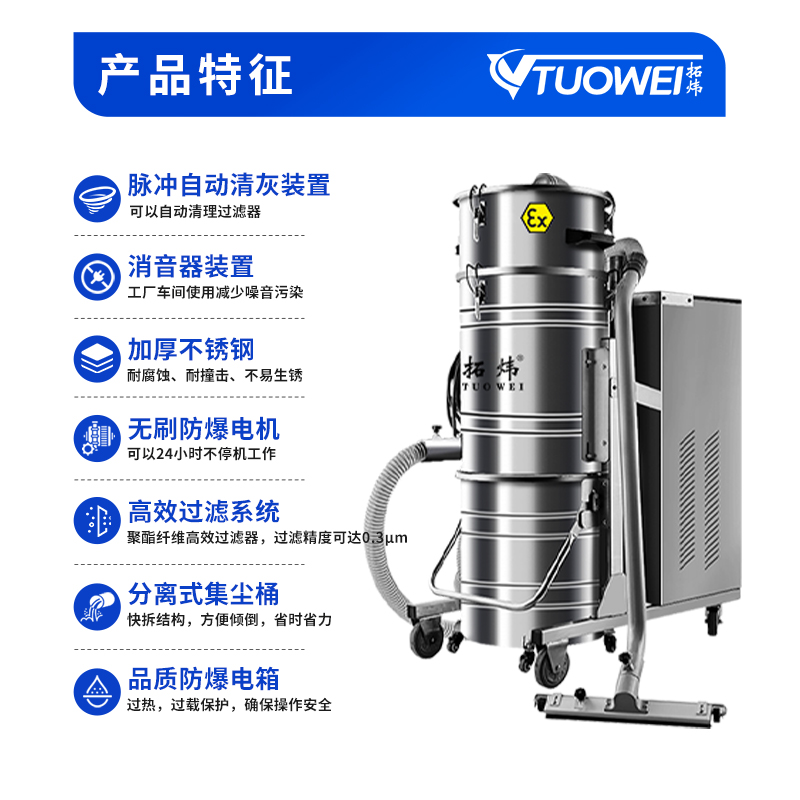 品牌:拓炜防爆等级:Ex d IIB T4 Gb/Ex d IIC T4 Gb适用范围:本系列产品属于电动防爆吸尘器,适用于爆炸性气体环境的1区、2区,用于清理回收粉尘(具有自燃特性的爆炸性粉尘除外)的设备,广泛用于石油化工、航空航天、军工、化学制药、食品等行业。整体采用重型机架结构设计,防爆脉冲清灰装置,不锈钢集尘桶构造,整机结构牢固可靠,确保在重工业环境下长时间保持稳定运行。...